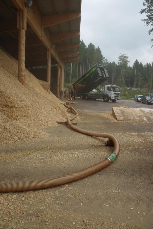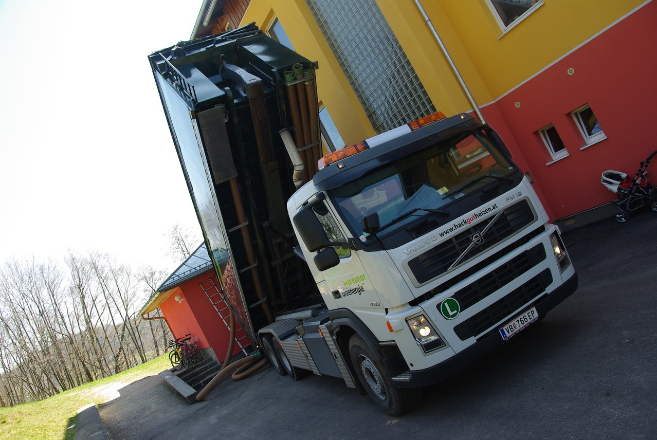 Das Spezialfahrzeug fasst 40 Kubikmeter Hackschnitzel pro Ladung und ermöglicht nicht nur eine staubfreie Anflieferung, sondern auch das Befüllen schwer zugänglicher oder verwinkelter Lagerräume. Bei einer Leistung von 1m³/Min. außerdem überzeugend schnell!