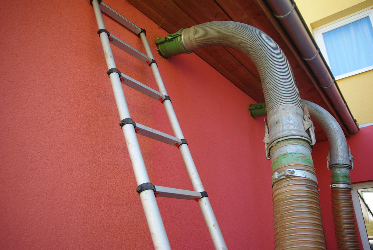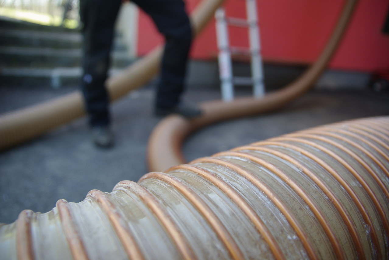 Mit unserem innovativen Hackschnitzel-Pumpwagen wird das Befüllen Ihres Hackschnitzellagers so einfach und bequem wie bei Pellets. Ein Druckluftkompressor pumpt die Hackschnitzel über einen Schlauch bis zu 40 Meter weit und bis zu 15 Meter hoch in den Lagerraum. Gleichzeitig wird über einen zweiten Schlauch die Abluft abgesaugt, wodurch ein leichter Unterdruck im Lagerraum entsteht. Der in der Abluft enthaltene Staub wird über eine Spezielle Filteranlage (insgesamt 14 Filterpatronen) absorbiert.